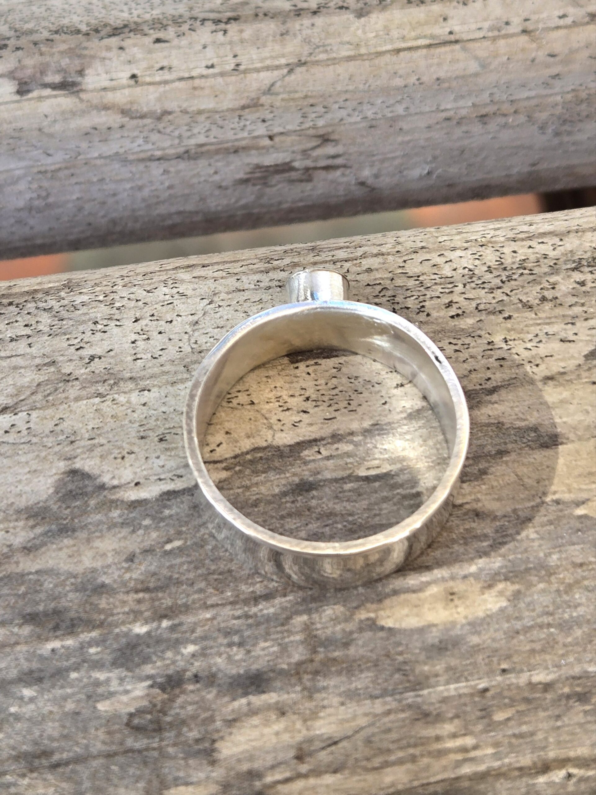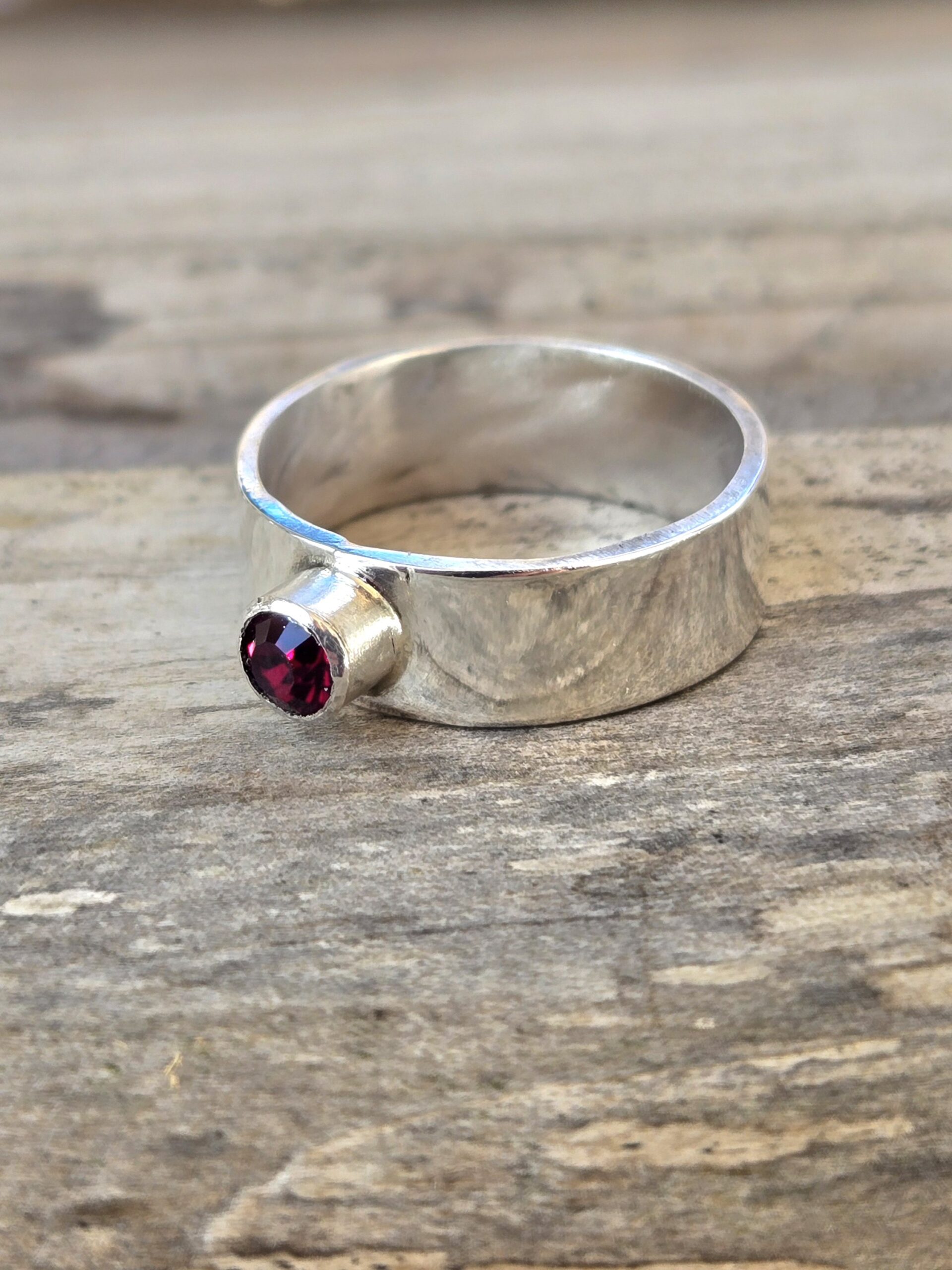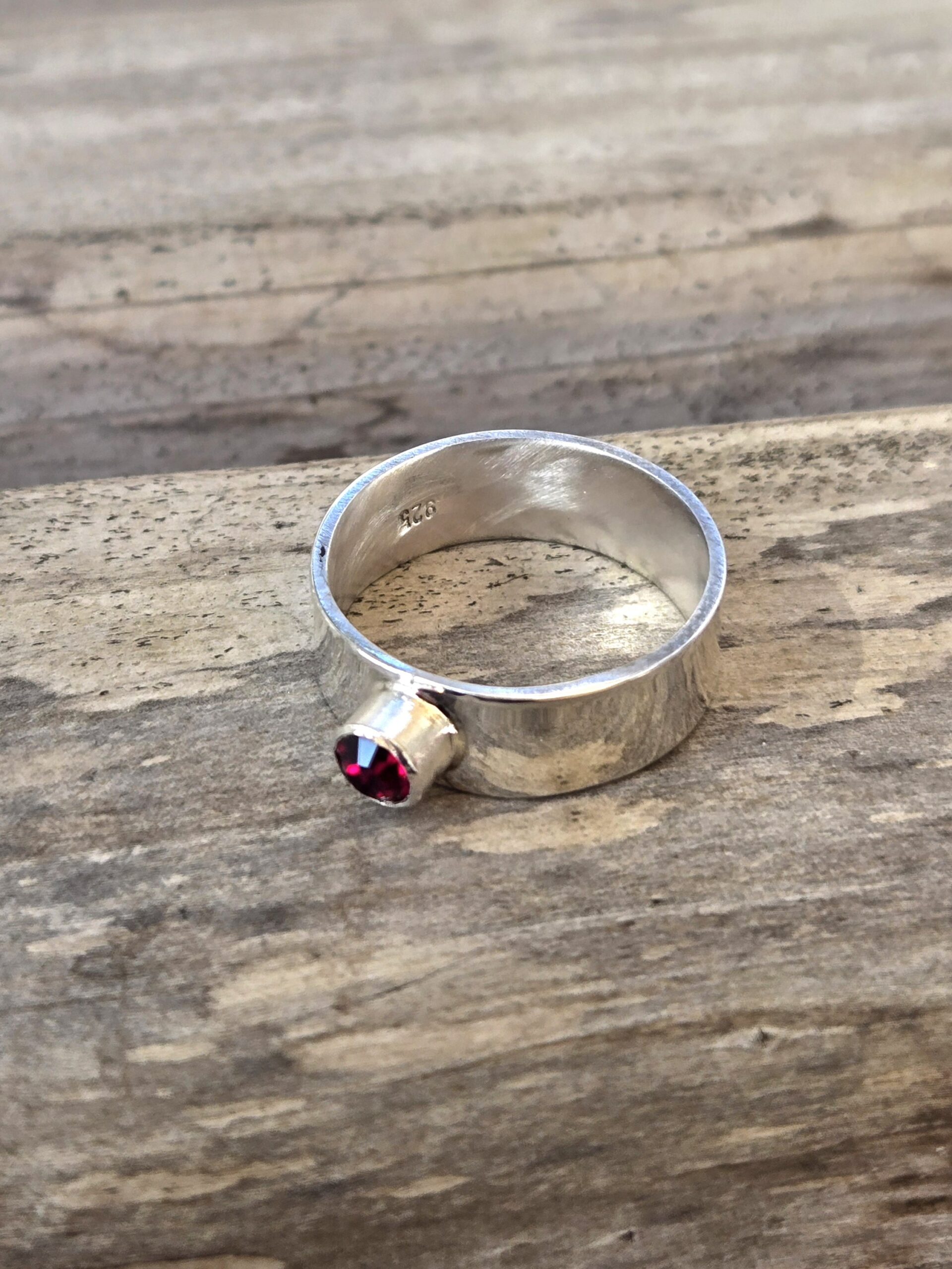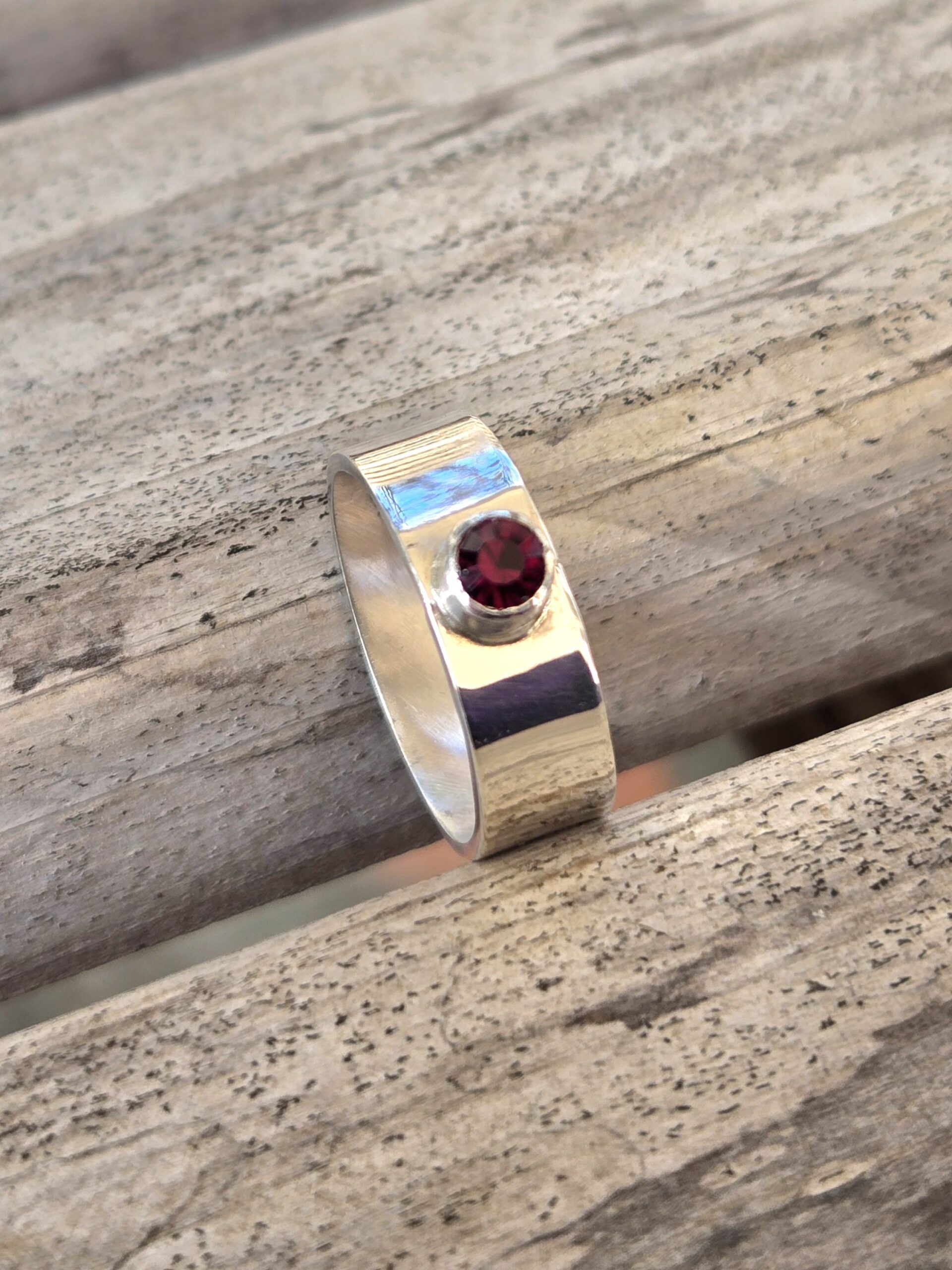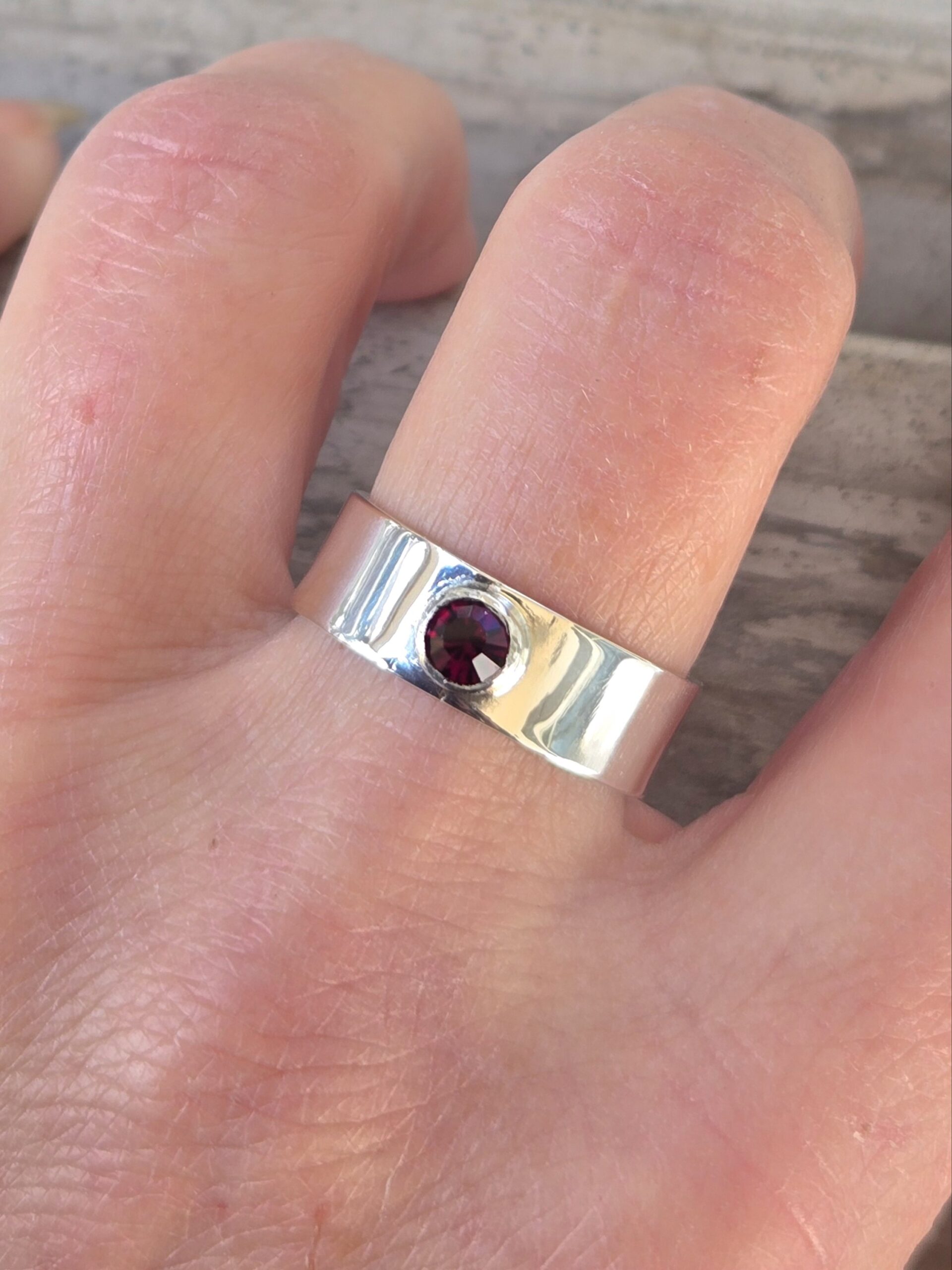 Our Garnet and Sterling Silver ring is amazing. Sanded and polished, it’s simple and elegant. The ring is roughly 1/4″ wide and is affixed with a Sterling bezel and 4mm Garnet crystal.