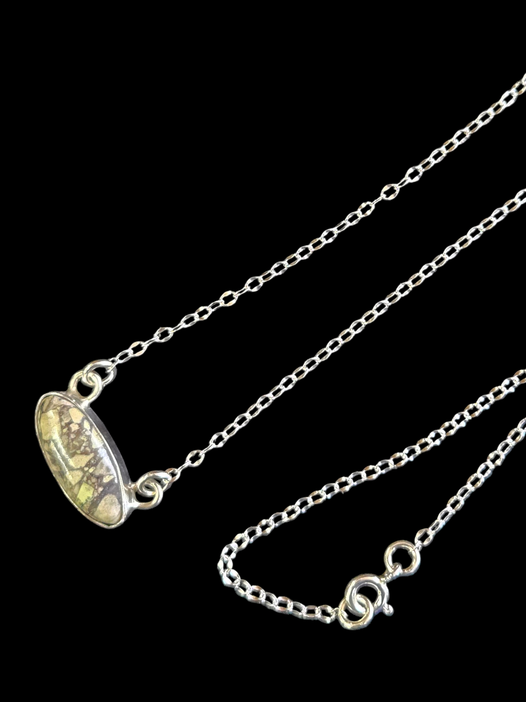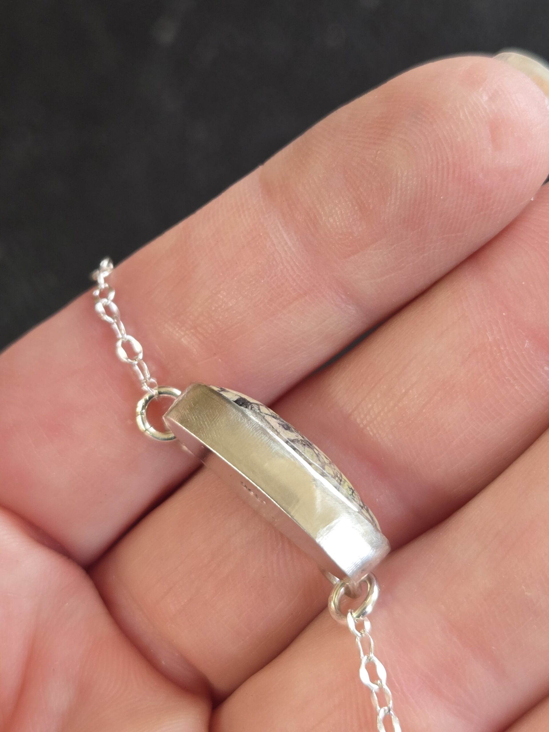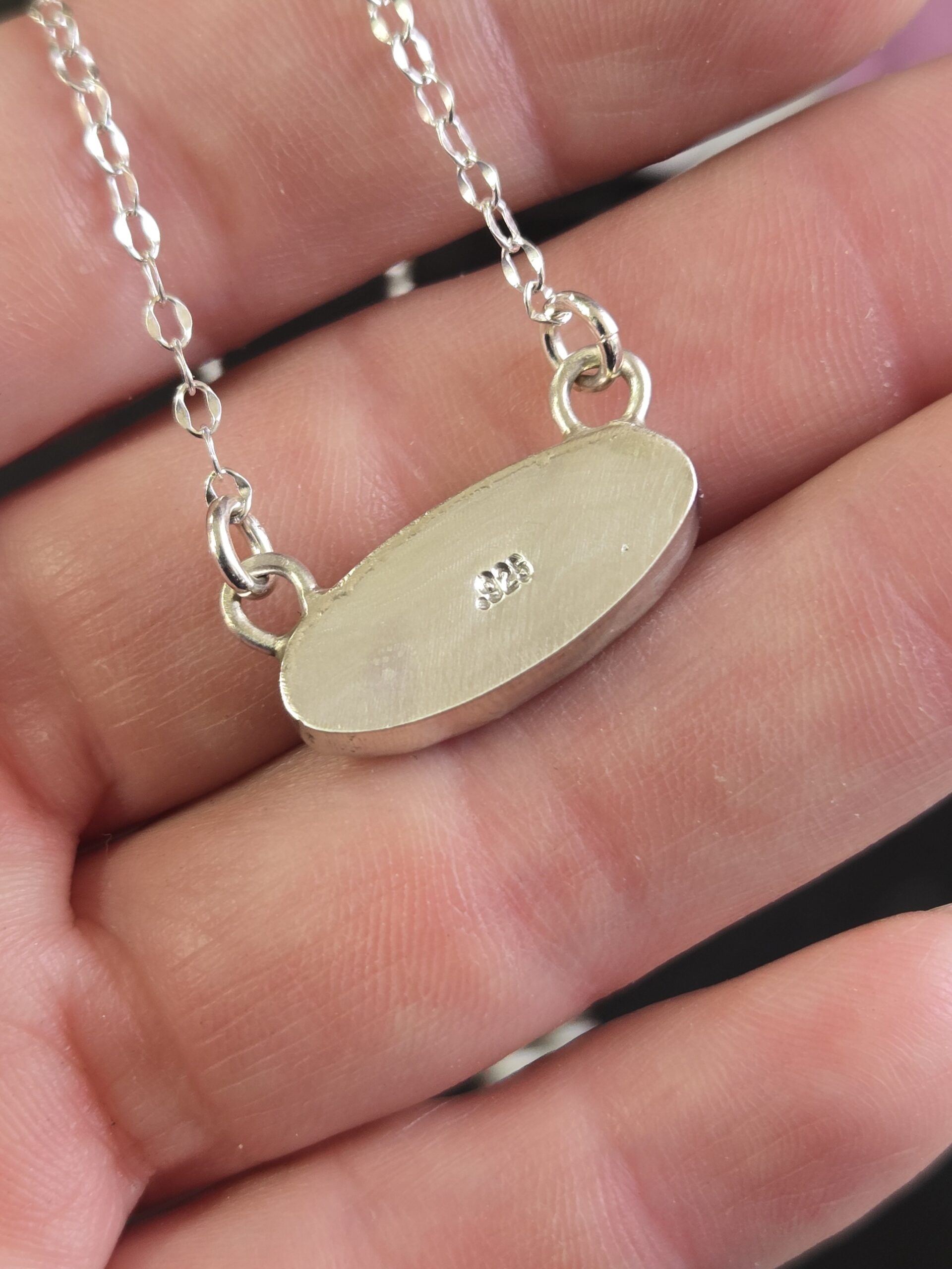 Our 2mm dapped sterling silver chain necklace is shown at roughly 17″ long. It’s been affixed with a handcrafted cabochon. The cabochon is roughly 7/8″ long and 1/4″ wide. The bezel is made of 925 sterling silver.